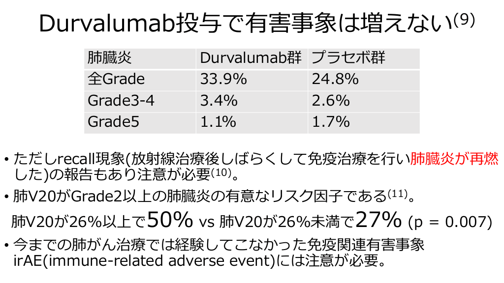 #21. Durvalumab投与で有害事象は増えない(9) 肺臓炎 全Grade Grade3-4 Grade5 Durvalumab群 33.9% 3.4% 1.1% プラセボ群 24.8% 2.6% 1.7% • ただしrecall現象(放射線治療後しばらくして免疫治療を⾏い肺臓炎が再燃 した)の報告もあり注意が必要(10)。 • 肺V20がGrade2以上の肺臓炎の有意なリスク因⼦である(11)。 肺V20が26%以上で50% vs 肺V20が26%未満で27% (p = 0.007) • 今までの肺がん治療では経験してこなかった免疫関連有害事象 irAE(immune-related adverse event)には注意が必要。