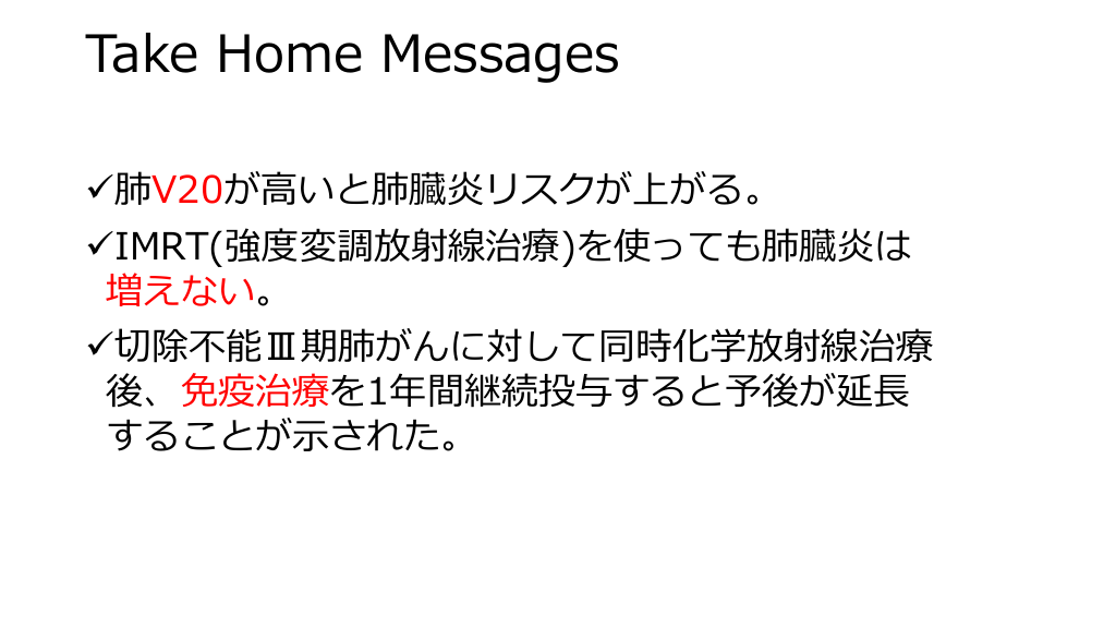 #3. Take Home Messages ü肺V20が⾼いと肺臓炎リスクが上がる。 üIMRT(強度変調放射線治療)を使っても肺臓炎は 増えない。 ü切除不能Ⅲ期肺がんに対して同時化学放射線治療 後、免疫治療を1年間継続投与すると予後が延⻑ することが⽰された。