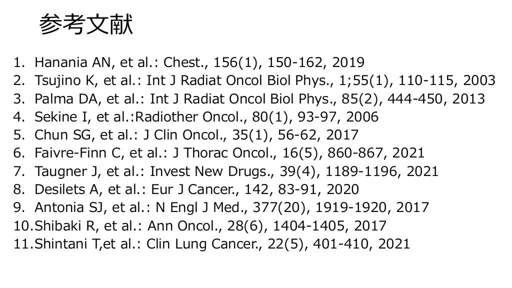 #24. 参考⽂献 1. Hanania AN, et al.: Chest., 156(1), 150-162, 2019 2. Tsujino K, et al.: Int J Radiat Oncol Biol Phys., 1;55(1), 110-115, 2003 3. Palma DA, et al.: Int J Radiat Oncol Biol Phys., 85(2), 444-450, 2013 4. Sekine I, et al.:Radiother Oncol., 80(1), 93-97, 2006 5. Chun SG, et al.: J Clin Oncol., 35(1), 56-62, 2017 6. Faivre-Finn C, et al.: J Thorac Oncol., 16(5), 860-867, 2021 7. Taugner J, et al.: Invest New Drugs., 39(4), 1189-1196, 2021 8. Desilets A, et al.: Eur J Cancer., 142, 83-91, 2020 9. Antonia SJ, et al.: N Engl J Med., 377(20), 1919-1920, 2017 10.Shibaki R, et al.: Ann Oncol., 28(6), 1404-1405, 2017 11.Shintani T,et al.: Clin Lung Cancer., 22(5), 401-410, 2021
