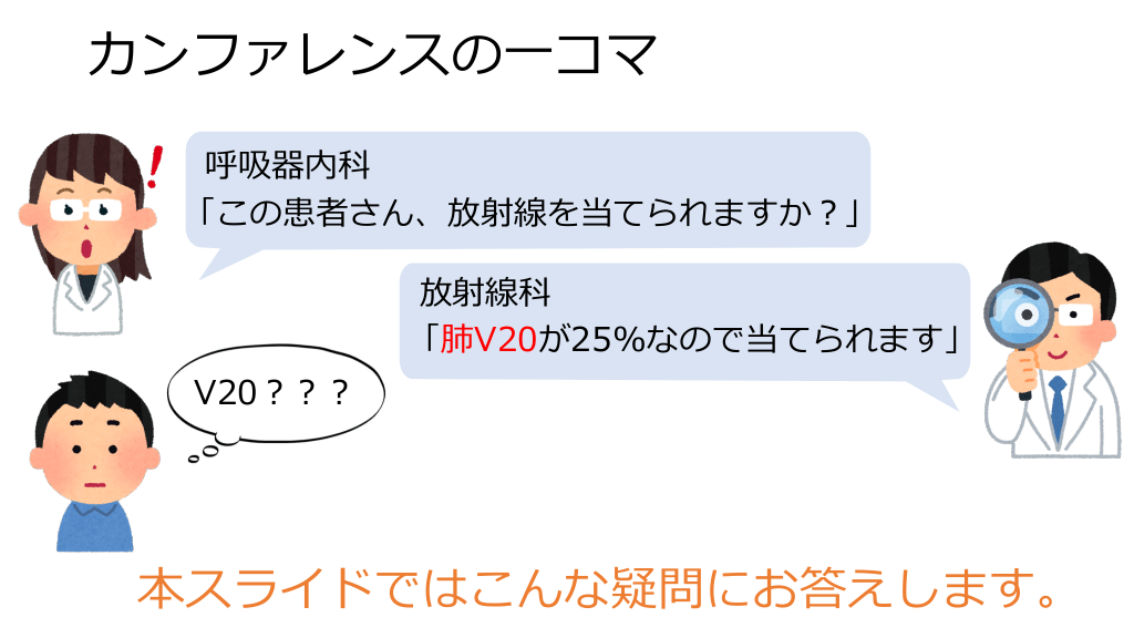#4. カンファレンスの⼀コマ 呼吸器内科 「この患者さん、放射線を当てられますか︖」 放射線科 「肺V20が25%なので当てられます」 V20︖︖︖ 本スライドではこんな疑問にお答えします。