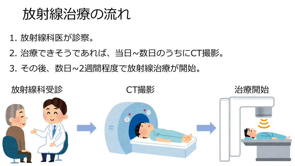 #5. 放射線治療の流れ 1. 放射線科医が診察。 2. 治療できそうであれば、当⽇~数⽇のうちにCT撮影。 3. その後、数⽇~2週間程度で放射線治療が開始。 放射線科受診 CT撮影 治療開始