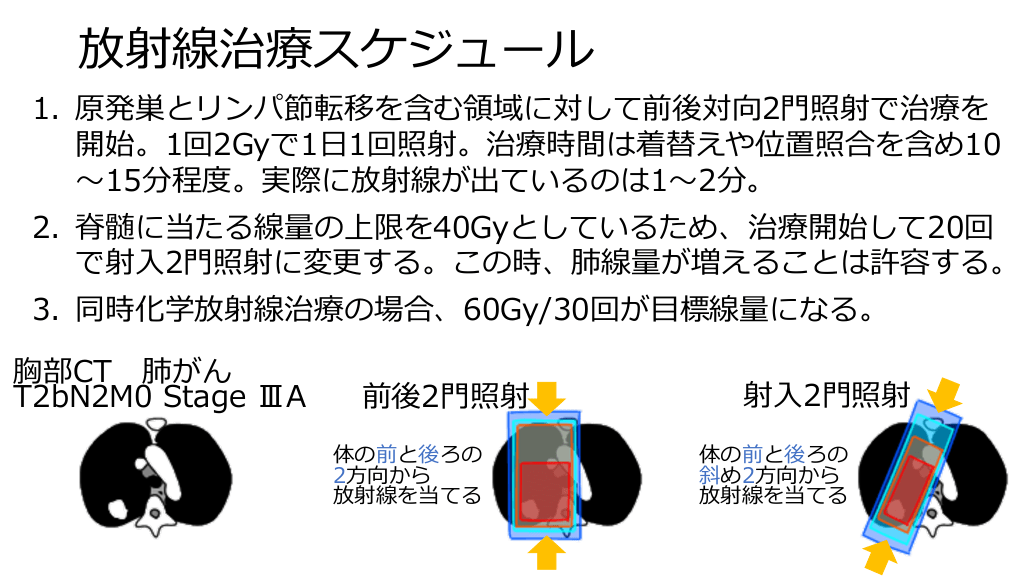 #6. 放射線治療スケジュール 1. 原発巣とリンパ節転移を含む領域に対して前後対向2⾨照射で治療を 開始。1回2Gyで1⽇1回照射。治療時間は着替えや位置照合を含め10 〜15分程度。実際に放射線が出ているのは1〜2分。 2. 脊髄に当たる線量の上限を40Gyとしているため、治療開始して20回 で射⼊2⾨照射に変更する。この時、肺線量が増えることは許容する。 3. 同時化学放射線治療の場合、60Gy/30回が⽬標線量になる。 胸部CT 肺がん T2bN2M0 Stage ⅢA 前後2⾨照射 体の前と後ろの 2⽅向から 放射線を当てる 射⼊2⾨照射 体の前と後ろの 斜め2⽅向から 放射線を当てる