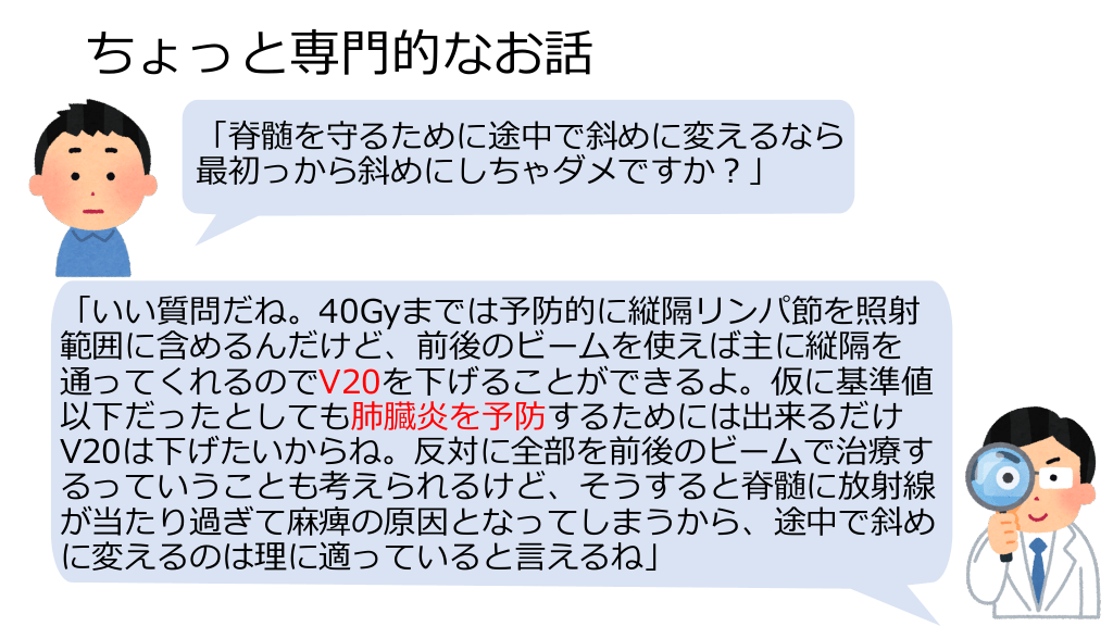 #7. ちょっと専⾨的なお話 「脊髄を守るために途中で斜めに変えるなら 最初っから斜めにしちゃダメですか︖」 「いい質問だね。40Gyまでは予防的に縦隔リンパ節を照射 範囲に含めるんだけど、前後のビームを使えば主に縦隔を 通ってくれるのでV20を下げることができるよ。仮に基準値 以下だったとしても肺臓炎を予防するためには出来るだけ V20は下げたいからね。反対に全部を前後のビームで治療す るっていうことも考えられるけど、そうすると脊髄に放射線 が当たり過ぎて⿇痺の原因となってしまうから、途中で斜め に変えるのは理に適っていると⾔えるね」