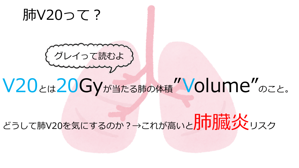 #8. 肺V20って︖ グレイって読むよ V20とは20Gyが当たる肺の体積”Volume”のこと。 肺臓炎リスク どうして肺V20を気にするのか︖→これが⾼いと