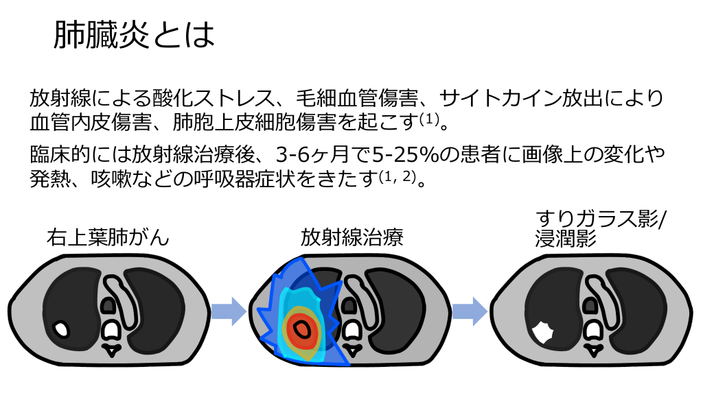 #9. 肺臓炎とは 放射線による酸化ストレス、⽑細⾎管傷害、サイトカイン放出により ⾎管内⽪傷害、肺胞上⽪細胞傷害を起こす(1)。 臨床的には放射線治療後、3-6ヶ⽉で5-25%の患者に画像上の変化や 発熱、咳嗽などの呼吸器症状をきたす(1, 2)。 右上葉肺がん 放射線治療 すりガラス影/ 浸潤影