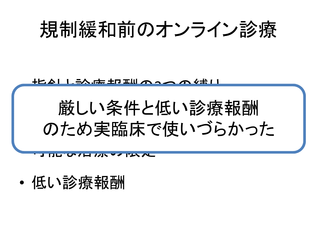 #10. 規制緩和前のオンライン診療 指針と診療報酬の2つの縛り