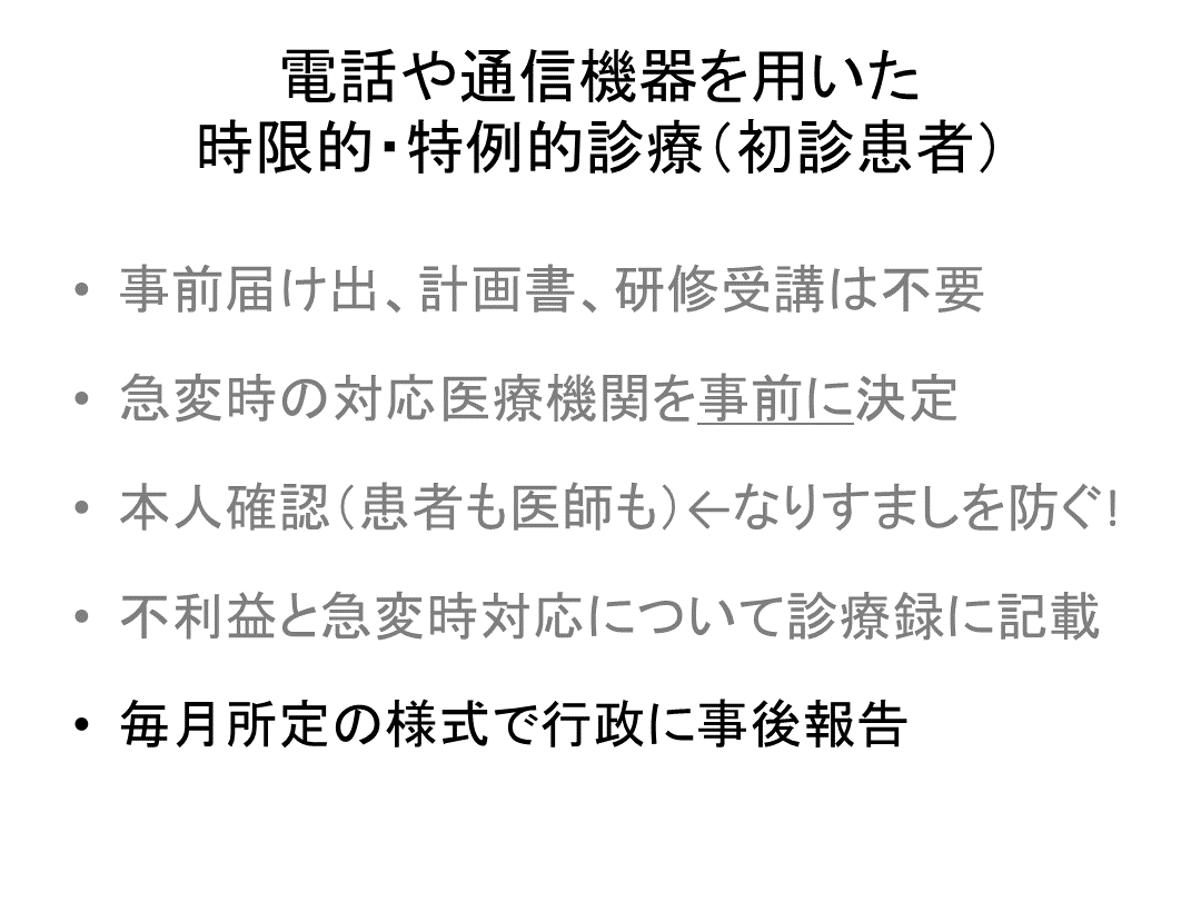 #30. 電話や通信機器を用いた時限的・特例的診療(初診患者) 事前届け出、計画書、研修受講は不要