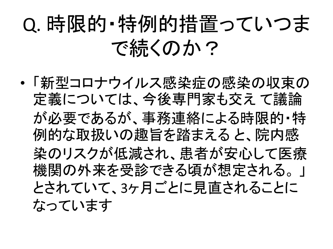 #56. Q. 時限的・特例的措置っていつまで続くのか? 「新型コロナウイルス感染症の感染の収束の定義については、今後専門家も交え て議論が必要であるが、事務連絡による時限的・特例的な取扱いの趣旨を踏まえる と、院内感染のリスクが低減され、患者が安心して医療機関の外来を受診できる頃が想定される。 」とされていて、3ヶ月ごとに見直されることになっています