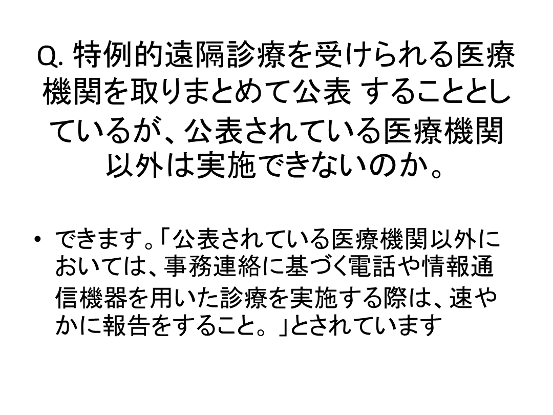 #57. Q. 特例的遠隔診療を受けられる医療機関を取りまとめて公表 することとしているが、公表されている医療機関以外は実施できないのか。 できます。「公表されている医療機関以外においては、事務連絡に基づく電話や情報通 信機器を用いた診療を実施する際は、速やかに報告をすること。 」とされています