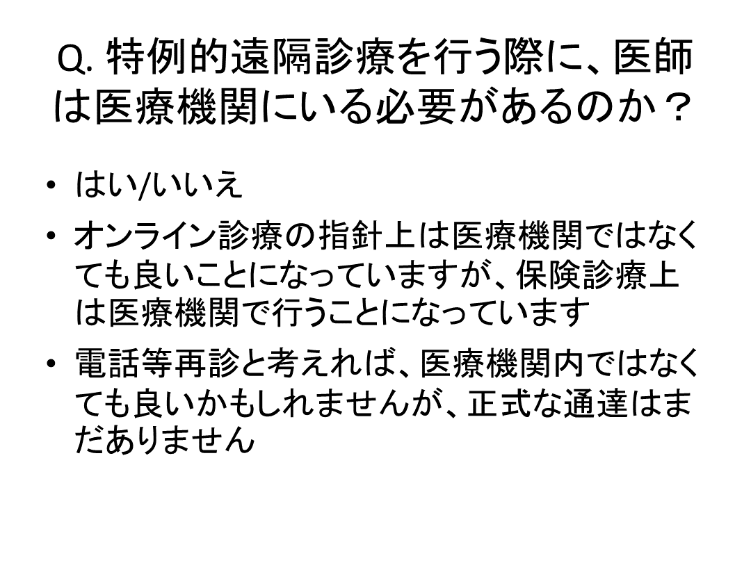 #58. Q. 特例的遠隔診療を行う際に、医師は医療機関にいる必要があるのか? はい/いいえ