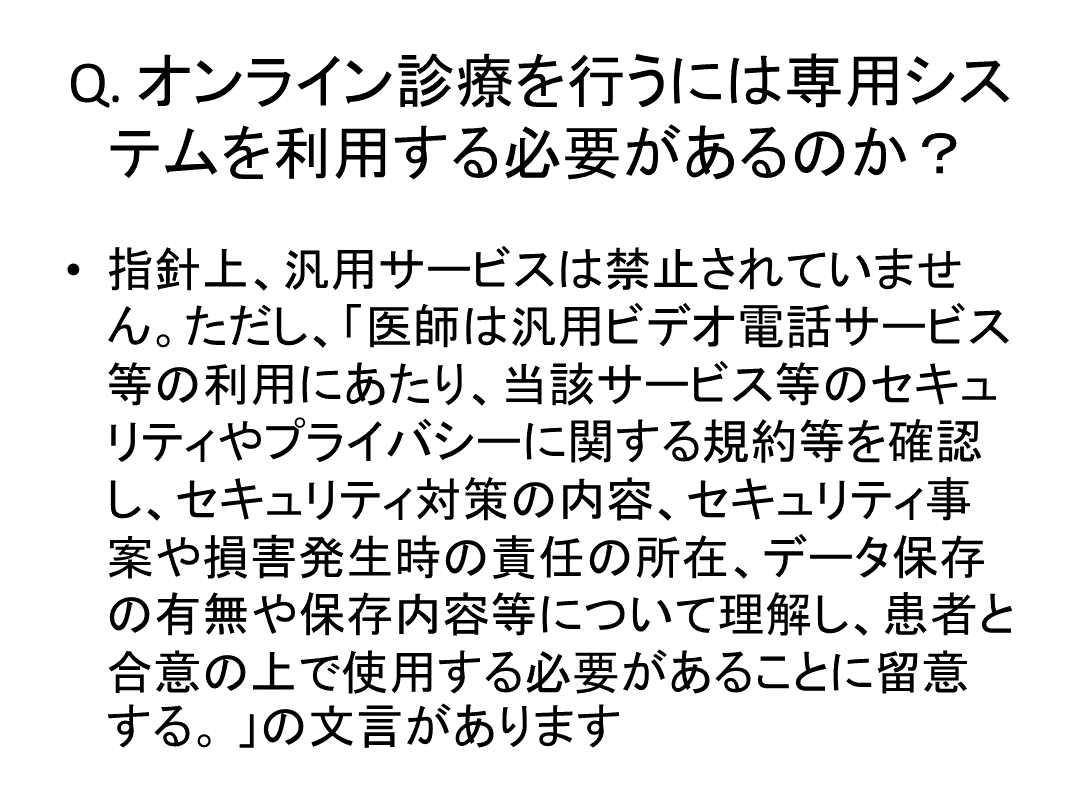 #59. Q. オンライン診療を行うには専用システムを利用する必要があるのか? 指針上、汎用サービスは禁止されていません。ただし、「医師は汎用ビデオ電話サービス等の利用にあたり、当該サービス等のセキュリティやプライバシーに関する規約等を確認し、セキュリティ対策の内容、セキュリティ事案や損害発生時の責任の所在、データ保存の有無や保存内容等について理解し、患者と合意の上で使用する必要があることに留意する。 」の文言があります