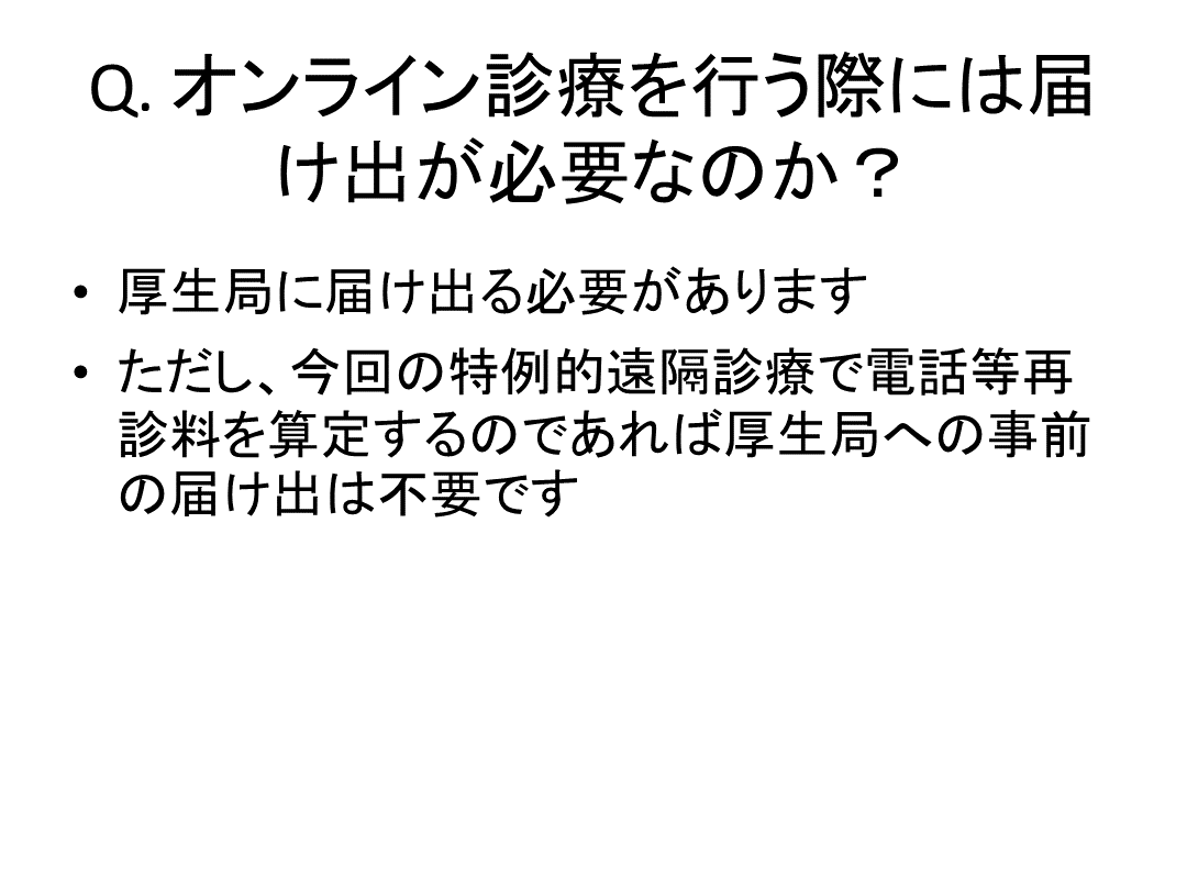 #60. Q. オンライン診療を行う際には届け出が必要なのか? 厚生局に届け出る必要があります