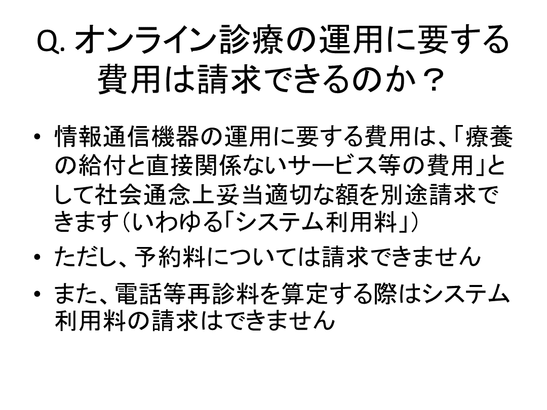 #61. Q. オンライン診療の運用に要する費用は請求できるのか? 情報通信機器の運用に要する費用は、「療養の給付と直接関係ないサービス等の費用」として社会通念上妥当適切な額を別途請求できます(いわゆる「システム利用料」)