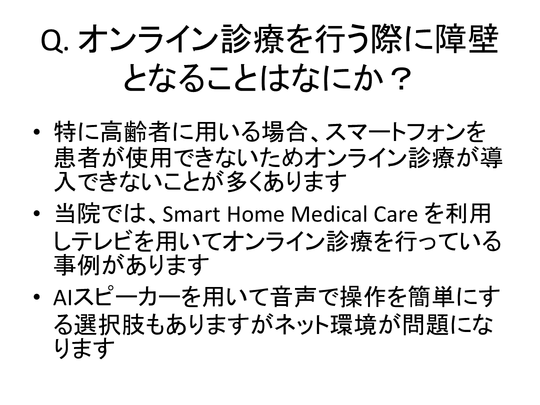 当院では、Smart Home Medical Care を利用しテレビを用いてオンライン診療を行っている事例があります