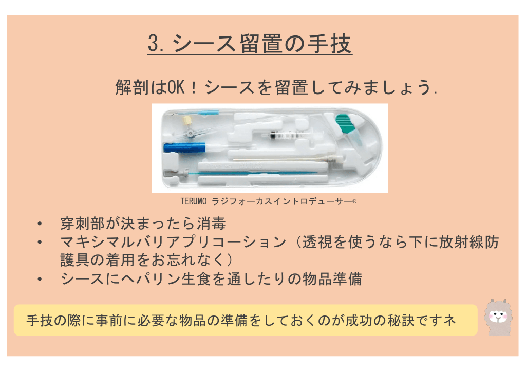 #10. 3.シース留置の手技 解剖はOK!シースを留置してみましょう. TERUMO ラジフォーカスイントロデューサー® • • • 穿刺部が決まったら消毒 マキシマルバリアプリコーション(透視を使うなら下に放射線防 護具の着用をお忘れなく) シースにヘパリン生食を通したりの物品準備 手技の際に事前に必要な物品の準備をしておくのが成功の秘訣ですネ