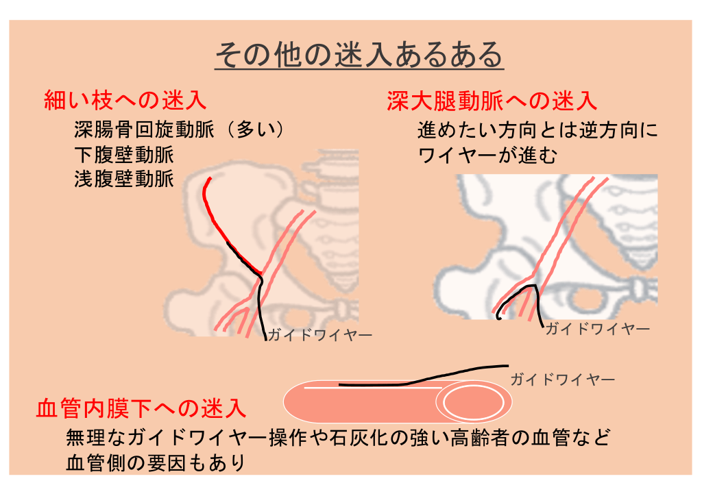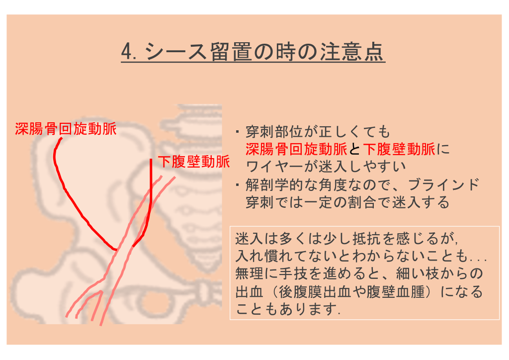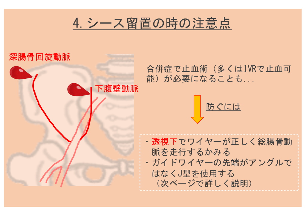 #14. 4.シース留置の時の注意点 深腸骨回旋動脈 合併症で止血術(多くはIVRで止血可 能)が必要になることも... 下腹壁動脈 防ぐには ・透視下でワイヤーが正しく総腸骨動 脈を走行するかみる ・ガイドワイヤーの先端がアングルで はなくJ型を使用する (次ページで詳しく説明)