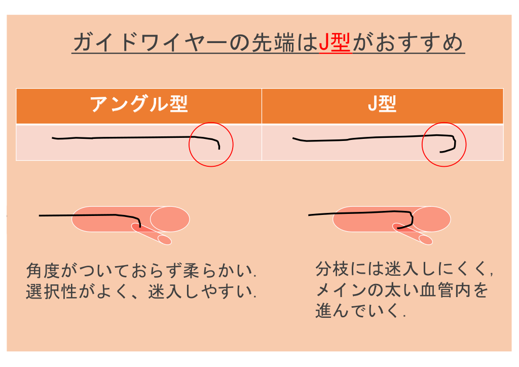 #15. ガイドワイヤーの先端はJ型がおすすめ アングル型 角度がついておらず柔らかい. 選択性がよく、迷入しやすい. J型 分枝には迷入しにくく, メインの太い血管内を 進んでいく.