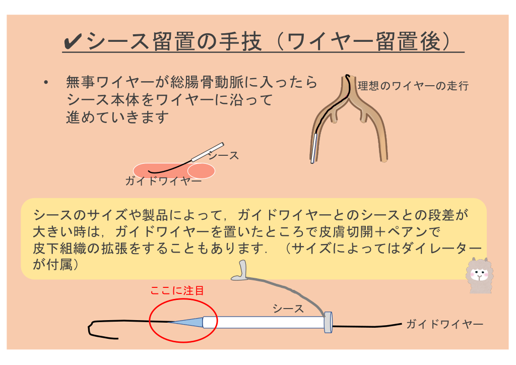 #16. ✔シース留置の手技(ワイヤー留置後) • 無事ワイヤーが総腸骨動脈に入ったら シース本体をワイヤーに沿って 進めていきます 理想のワイヤーの走行 シース ガイドワイヤー シースのサイズや製品によって,ガイドワイヤーとのシースとの段差が 大きい時は,ガイドワイヤーを置いたところで皮膚切開+ペアンで 皮下組織の拡張をすることもあります.(サイズによってはダイレーター が付属) ここに注目 シース ガイドワイヤー