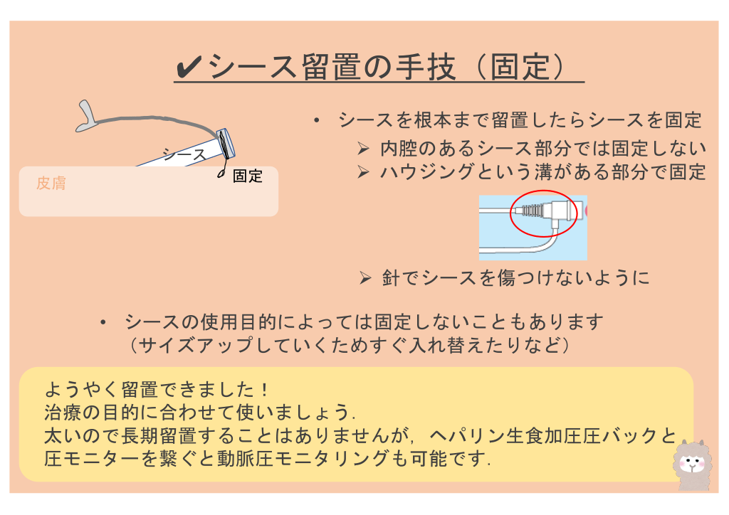 #17. ✔シース留置の手技(固定) シース 皮膚 固定 • シースを根本まで留置したらシースを固定 Ø 内腔のあるシース部分では固定しない Ø ハウジングという溝がある部分で固定 Ø 針でシースを傷つけないように • シースの使用目的によっては固定しないこともあります (サイズアップしていくためすぐ入れ替えたりなど) ようやく留置できました! 治療の目的に合わせて使いましょう. 太いので長期留置することはありませんが,ヘパリン生食加圧圧バックと 圧モニターを繋ぐと動脈圧モニタリングも可能です.
