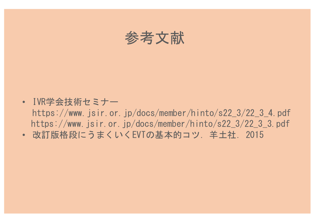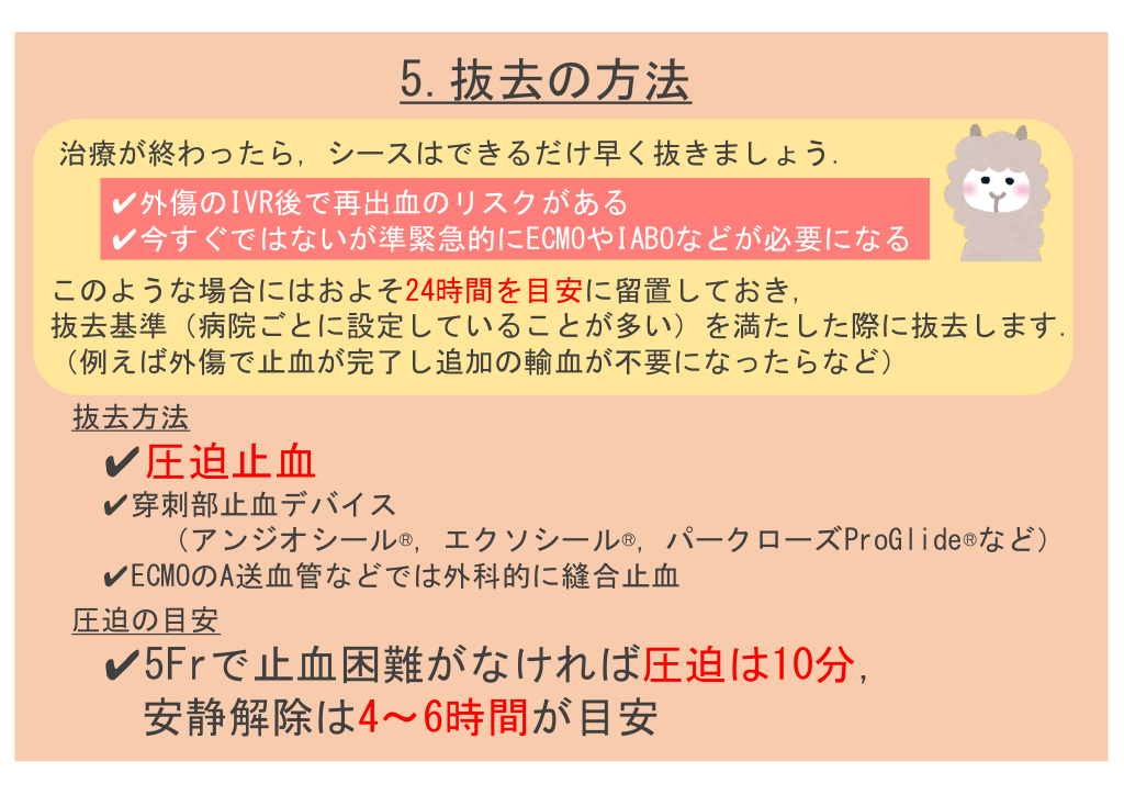 #18. 5.抜去の方法 治療が終わったら,シースはできるだけ早く抜きましょう. ✔外傷のIVR後で再出血のリスクがある ✔今すぐではないが準緊急的にECMOやIABOなどが必要になる このような場合にはおよそ24時間を目安に留置しておき, 抜去基準(病院ごとに設定していることが多い)を満たした際に抜去します. (例えば外傷で止血が完了し追加の輸血が不要になったらなど) 抜去方法 ✔圧迫止血 ✔穿刺部止血デバイス (アンジオシール®,エクソシール®,パークローズProGlide®など) ✔ECMOのA送血管などでは外科的に縫合止血 圧迫の目安 ✔5Frで止血困難がなければ圧迫は10分, 安静解除は4〜6時間が目安