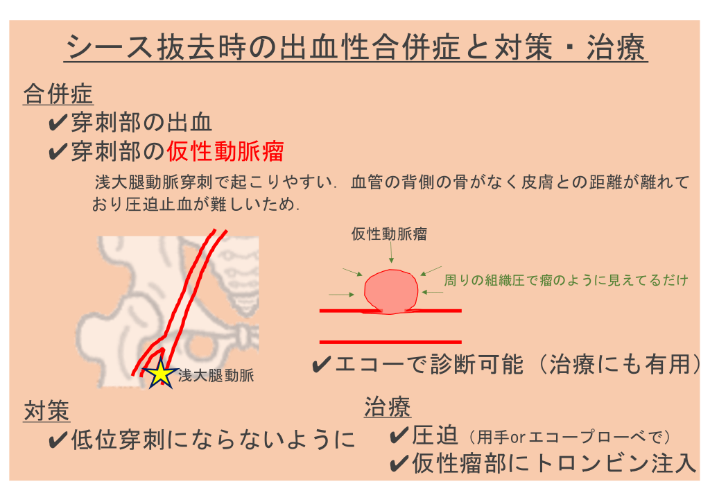 #19. シース抜去時の出血性合併症と対策・治療 合併症 ✔穿刺部の出血 ✔穿刺部の仮性動脈瘤 浅大腿動脈穿刺で起こりやすい.血管の背側の骨がなく皮膚との距離が離れて おり圧迫止血が難しいため. 仮性動脈瘤 周りの組織圧で瘤のように見えてるだけ 浅大腿動脈 ✔エコーで診断可能(治療にも有用) 治療 対策 ✔低位穿刺にならないように ✔圧迫(用手orエコープローべで) ✔仮性瘤部にトロンビン注入