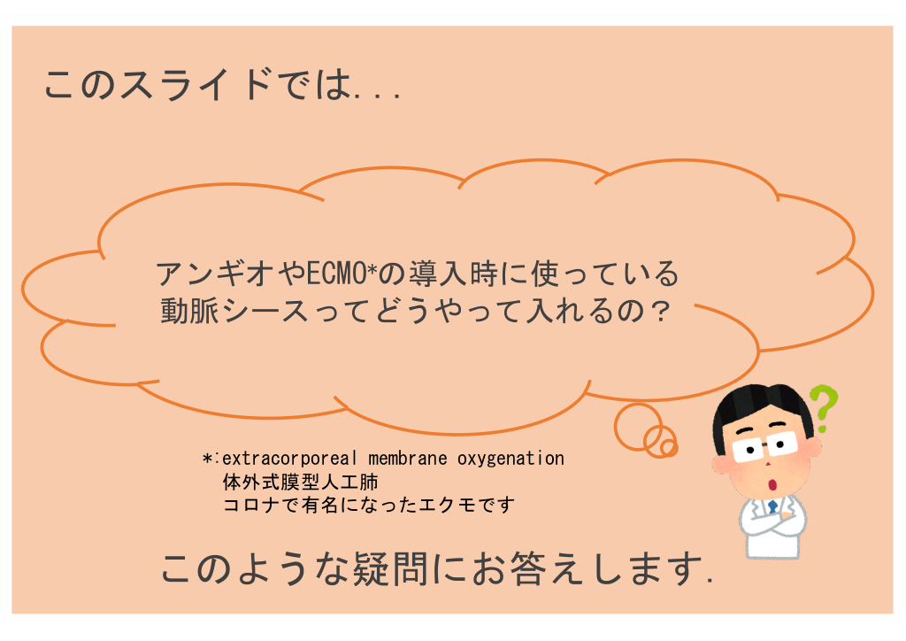 #2. このスライドでは... アンギオやECMO*の導入時に使っている 動脈シースってどうやって入れるの? *:extracorporeal membrane oxygenation 体外式膜型人工肺 コロナで有名になったエクモです このような疑問にお答えします.