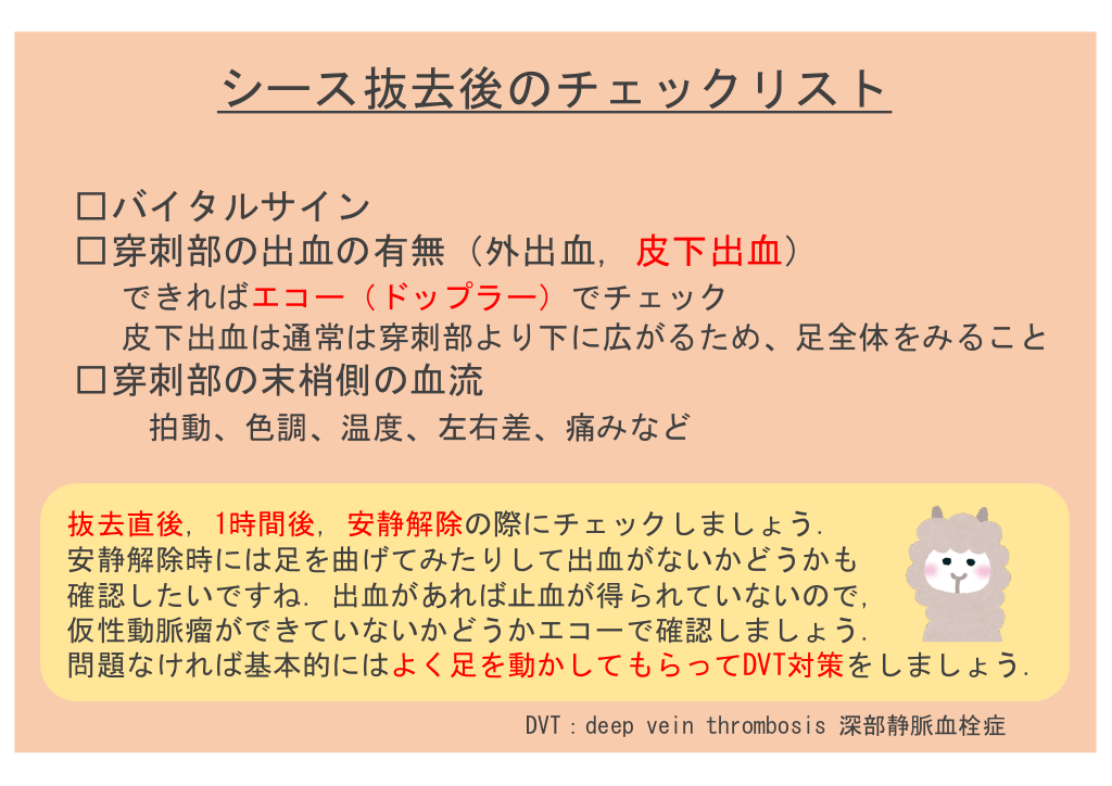 #20. シース抜去後のチェックリスト □バイタルサイン □穿刺部の出血の有無(外出血,皮下出血) できればエコー(ドップラー)でチェック 皮下出血は通常は穿刺部より下に広がるため、足全体をみること □穿刺部の末梢側の血流 拍動、色調、温度、左右差、痛みなど 抜去直後,1時間後,安静解除の際にチェックしましょう. 安静解除時には足を曲げてみたりして出血がないかどうかも 確認したいですね.出血があれば止血が得られていないので, 仮性動脈瘤ができていないかどうかエコーで確認しましょう. 問題なければ基本的にはよく足を動かしてもらってDVT対策をしましょう. DVT:deep vein thrombosis 深部静脈血栓症
