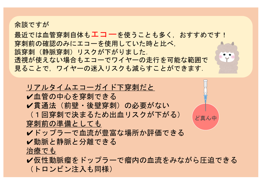 #21. 余談ですが 最近では血管穿刺自体もエコーを使うことも多く,おすすめです! 穿刺前の確認のみにエコーを使用していた時と比べ, 誤穿刺(静脈穿刺)リスクが下がりました. 透視が使えない場合もエコーでワイヤーの走行を可能な範囲で 見ることで,ワイヤーの迷入リスクも減らすことができます. リアルタイムエコーガイド下穿刺だと ✔血管の中心を穿刺できる ✔貫通法(前壁・後壁穿刺)の必要がない (1回穿刺で決まるため出血リスクが下がる) ど真ん中 穿刺前の準備としても ✔ドップラーで血流が豊富な場所か評価できる ✔動脈と静脈と分離できる 治療でも ✔仮性動脈瘤をドップラーで瘤内の血流をみながら圧迫できる (トロンビン注入も同様)