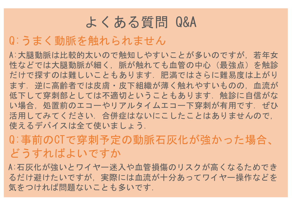 #22. よくある質問 Q&A Q:うまく動脈を触れられません A:大腿動脈は比較的太いので触知しやすいことが多いのですが,若年女 性などでは大腿動脈が細く,脈が触れても血管の中心(最強点)を触診 だけで探すのは難しいこともあります.肥満ではさらに難易度は上がり ます.逆に高齢者では皮膚・皮下組織が薄く触れやすいものの,血流が 低下して穿刺部としては不適切ということもあります.触診に自信がな い場合,処置前のエコーやリアルタイムエコー下穿刺が有用です.ぜひ 活用してみてください.合併症はないにこしたことはありませんので, 使えるデバイスは全て使いましょう. Q:事前のCTで穿刺予定の動脈石灰化が強かった場合、 どうすればよいですか A:石灰化が強いとワイヤー迷入や血管損傷のリスクが高くなるためでき るだけ避けたいですが,実際には血流が十分あってワイヤー操作などを 気をつければ問題ないことも多いです.