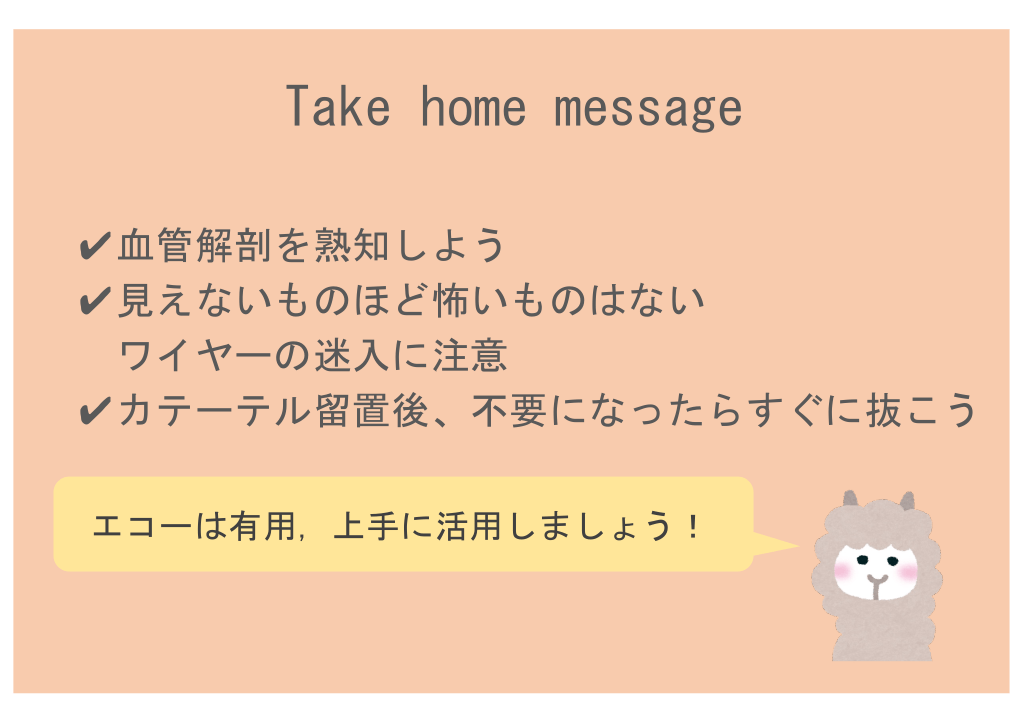 #24. Take home message ✔血管解剖を熟知しよう ✔見えないものほど怖いものはない ワイヤーの迷入に注意 ✔カテーテル留置後、不要になったらすぐに抜こう エコーは有用,上手に活用しましょう!