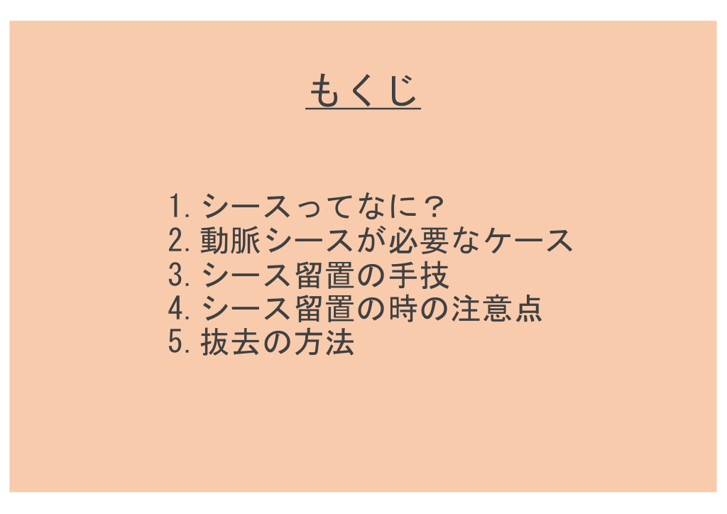 #3. もくじ 1.シースってなに? 2.動脈シースが必要なケース 3.シース留置の手技 4.シース留置の時の注意点 5.抜去の方法