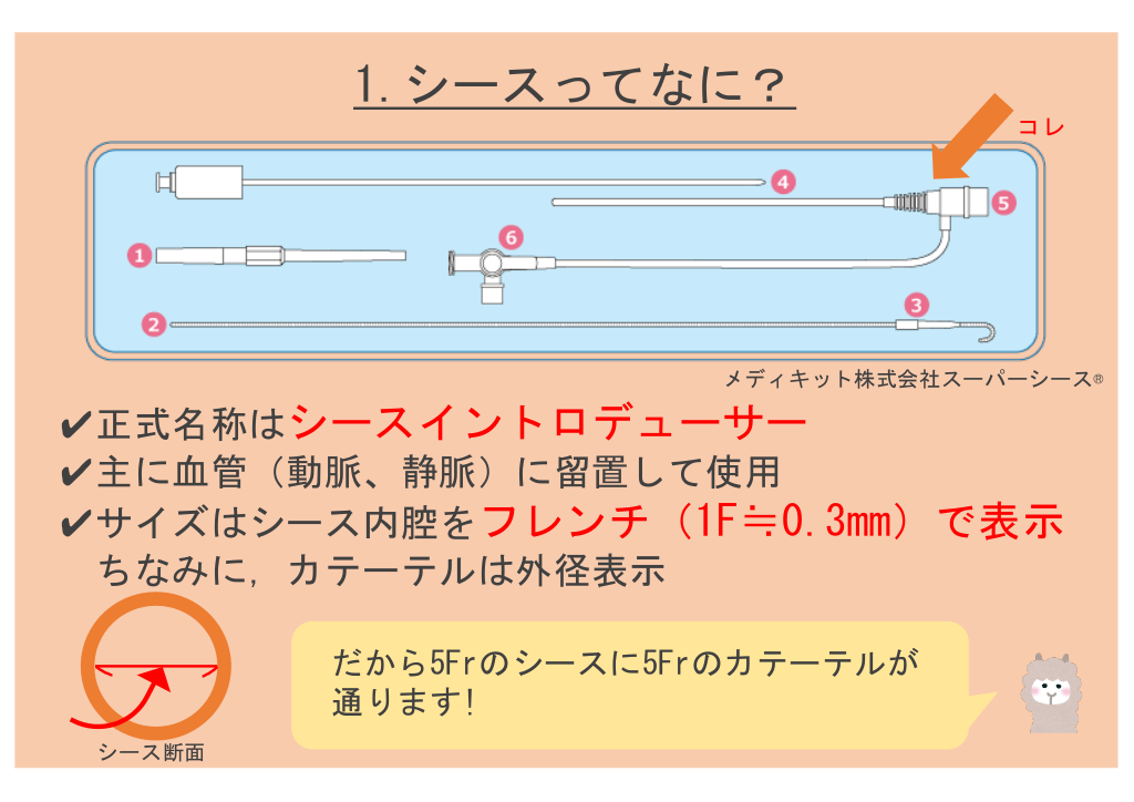 #4. 1.シースってなに? コレ メディキット株式会社スーパーシース® ✔正式名称はシースイントロデューサー ✔主に血管(動脈、静脈)に留置して使用 ✔サイズはシース内腔をフレンチ(1F≒0.3mm)で表示 ちなみに,カテーテルは外径表示 だから5Frのシースに5Frのカテーテルが 通ります! シース断面