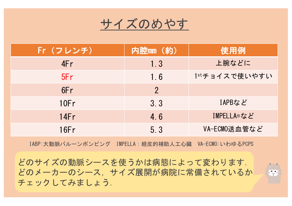 #5. サイズのめやす Fr(フレンチ) 内腔mm(約) 使用例 4Fr 1.3 上腕などに 5Fr 1.6 1stチョイスで使いやすい 6Fr 2 10Fr 3.3 IAPBなど 14Fr 4.6 IMPELLA®など 16Fr 5.3 VA-ECMO送血管など IABP:大動脈バルーンポンピング IMPELLA:経皮的補助人工心臓 VA-ECMO:いわゆるPCPS どのサイズの動脈シースを使うかは病態によって変わります. どのメーカーのシース,サイズ展開が病院に常備されているか チェックしてみましょう.