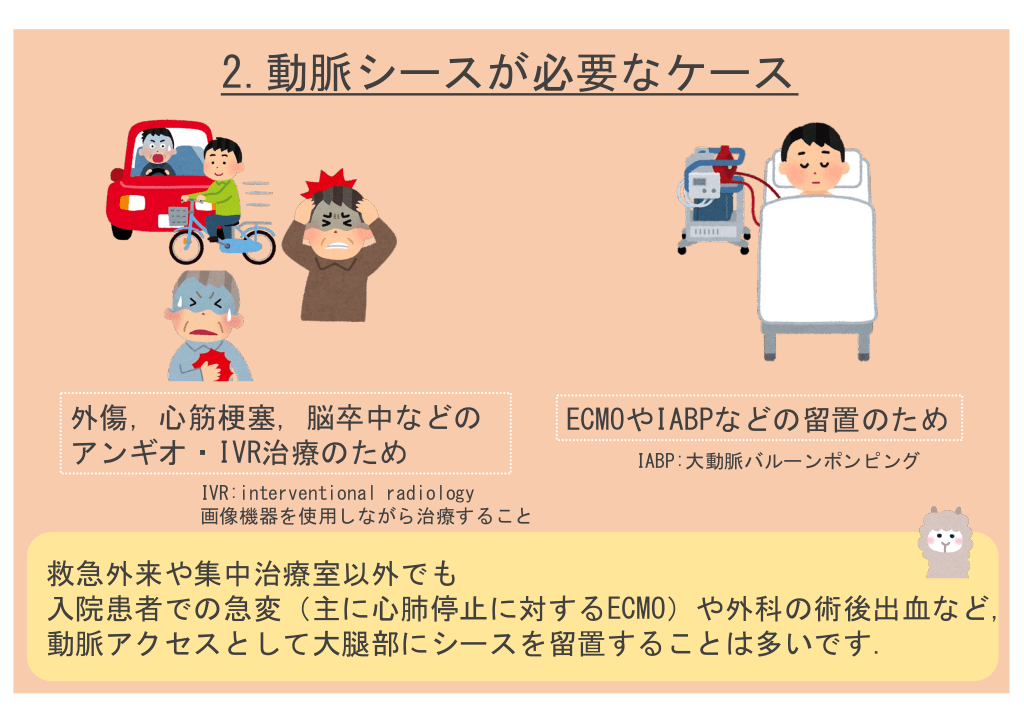 #6. 2.動脈シースが必要なケース 外傷,心筋梗塞,脳卒中などの アンギオ・IVR治療のため ECMOやIABPなどの留置のため IABP:大動脈バルーンポンピング IVR:interventional radiology 画像機器を使用しながら治療すること 救急外来や集中治療室以外でも 入院患者での急変(主に心肺停止に対するECMO)や外科の術後出血など, 動脈アクセスとして大腿部にシースを留置することは多いです.