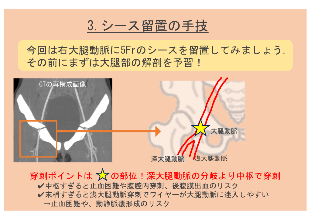 #8. 3.シース留置の手技 今回は右大腿動脈に5Frのシースを留置してみましょう. その前にまずは大腿部の解剖を予習! CTの再構成画像 大腿動脈 深大腿動脈 穿刺ポイントは 浅大腿動脈 の部位!深大腿動脈の分岐より中枢で穿刺 ✔中枢すぎると止血困難や腹腔内穿刺、後腹膜出血のリスク ✔末梢すぎると浅大腿動脈穿刺でワイヤーが大腿動脈に迷入しやすい →止血困難や、動静脈瘻形成のリスク