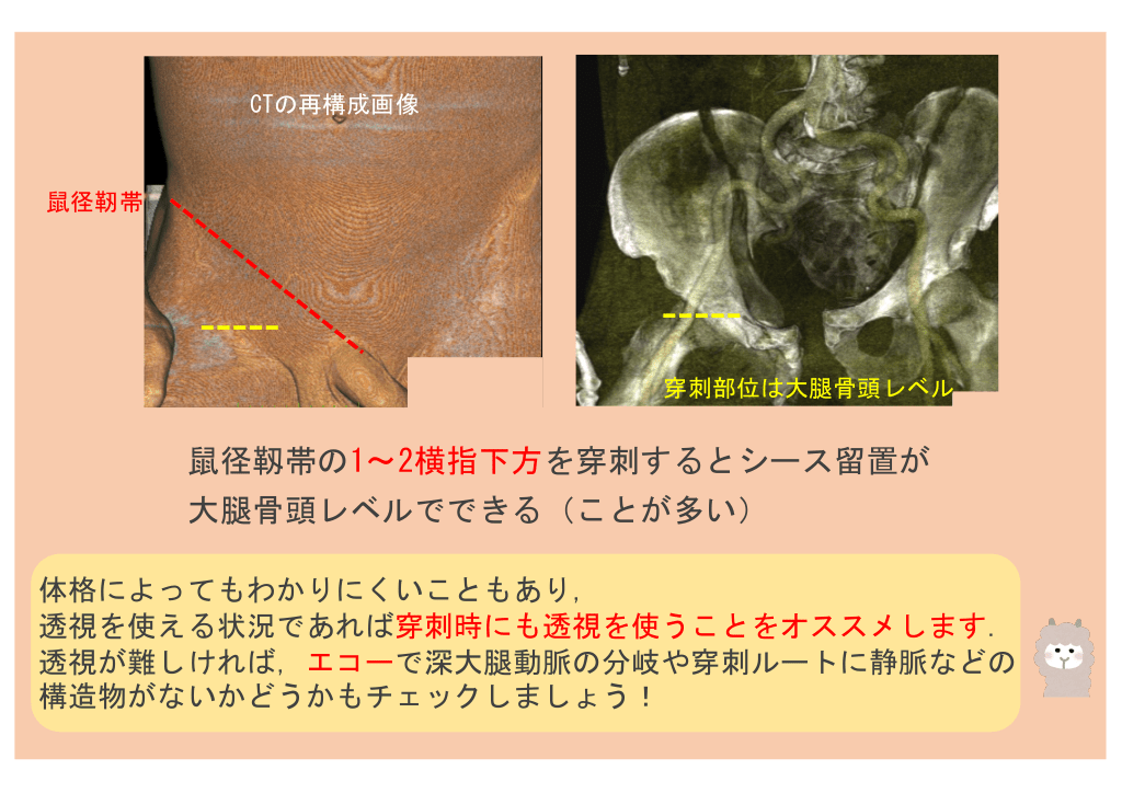 #9. CTの再構成画像 鼠径靭帯 穿刺部位は大腿骨頭レベル 鼠径靱帯の1~2横指下方を穿刺するとシース留置が 大腿骨頭レベルでできる(ことが多い) 体格によってもわかりにくいこともあり, 透視を使える状況であれば穿刺時にも透視を使うことをオススメします. 透視が難しければ,エコーで深大腿動脈の分岐や穿刺ルートに静脈などの 構造物がないかどうかもチェックしましょう!