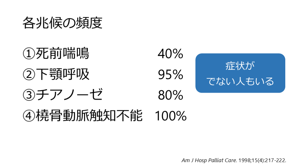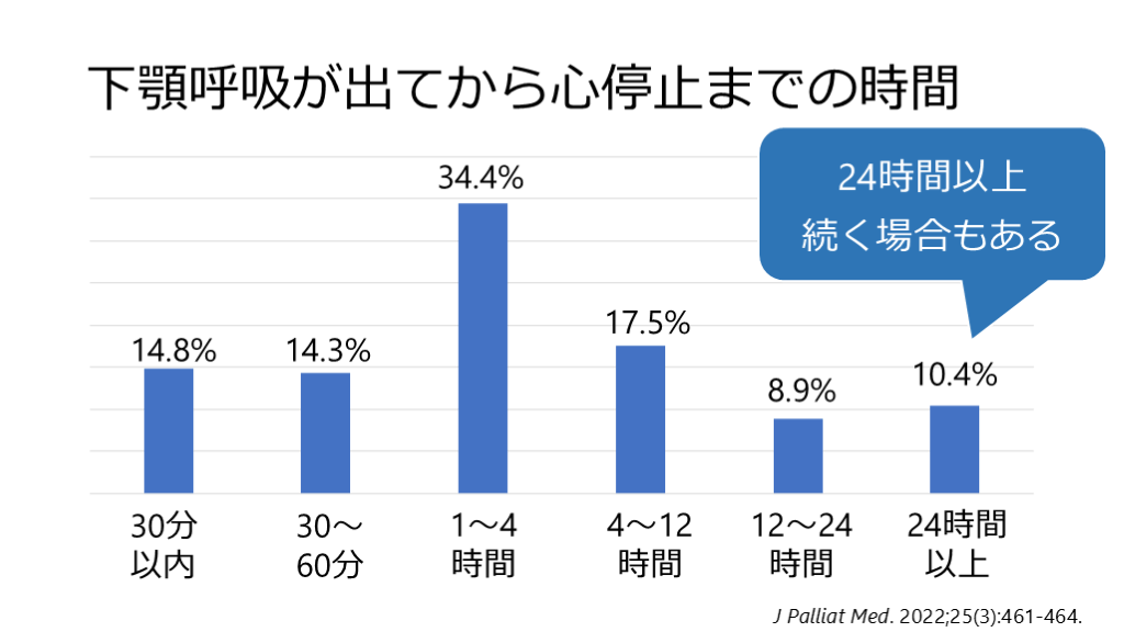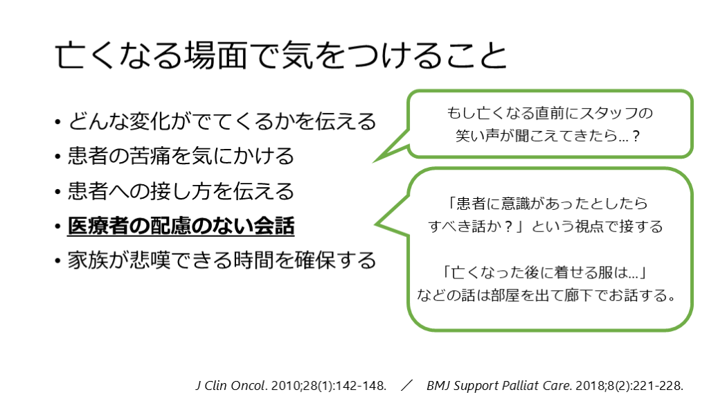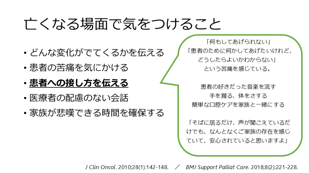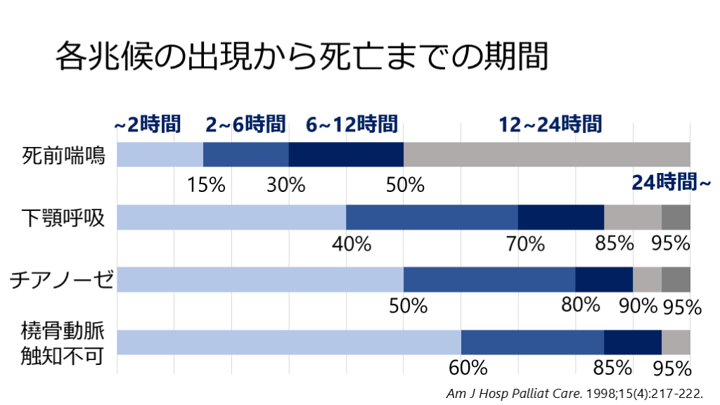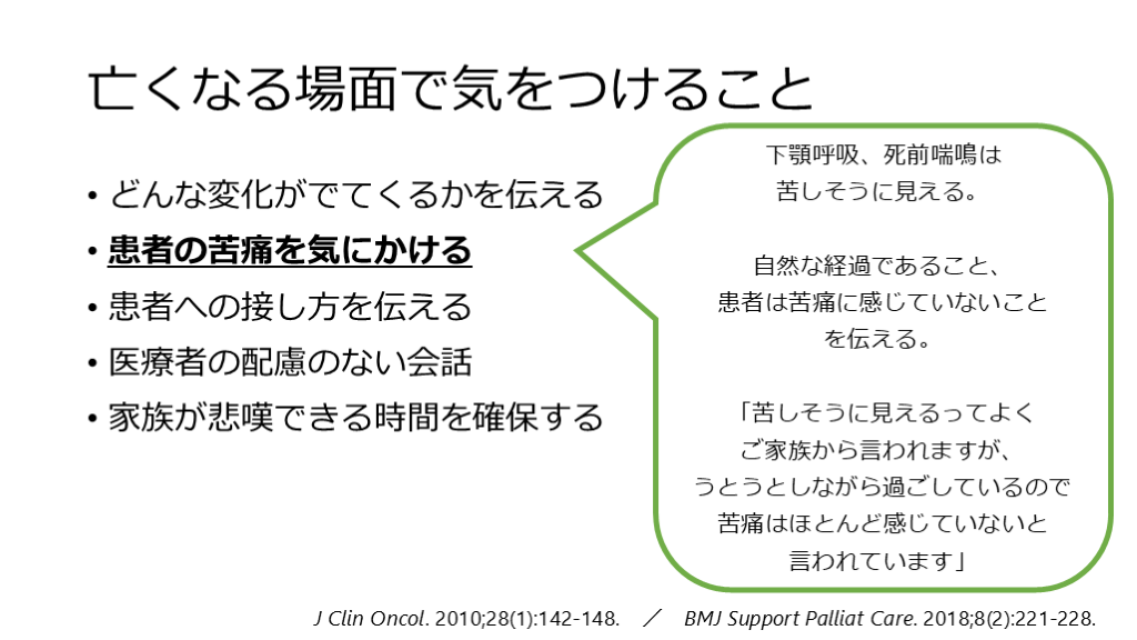 家族が悲嘆できる時間を確保する J Clin Oncol. 2010;28(1):142-148. / BMJ Support Palliat Care. 2018;8(2):221-228. 下顎呼吸、死前喘鳴は
