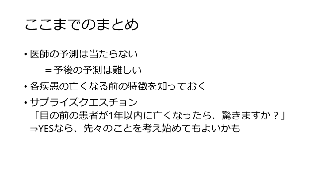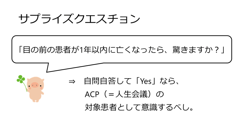 サプライズクエスチョン「目の前の患者が1年以内に亡くなったら、驚きますか?」⇒YESなら、先々のことを考え始めてもよいかも