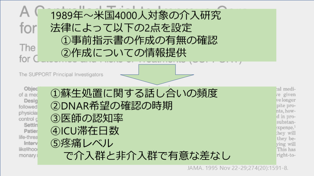 法律によって以下の2点を設定 ①事前指示書の作成の有無の確認 ②作成についての情報提供 ①蘇生処置に関する話し合いの頻度
