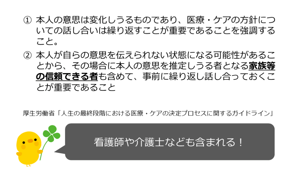 本人が自らの意思を伝えられない状態になる可能性があることから、その場合に本人の意思を推定しうる者となる家族等の信頼できる者も含めて、事前に繰り返し話し合っておくことが重要であること
