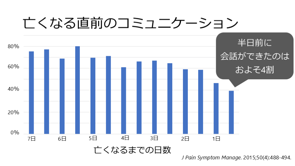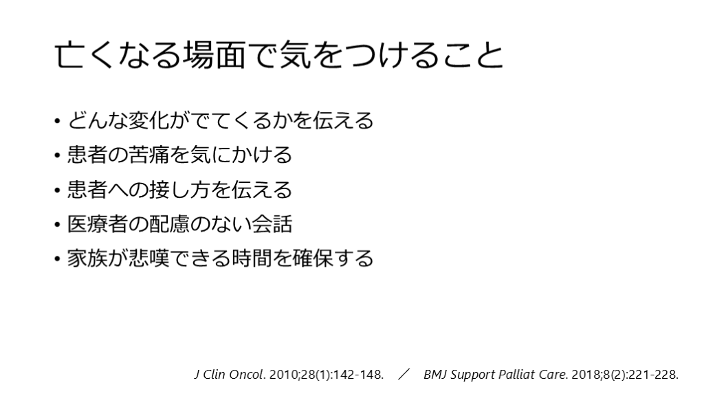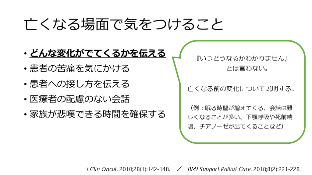 (例:眠る時間が増えてくる、会話は難しくなることが多い、下顎呼吸や死前喘鳴、チアノーゼが出てくることなど) J Clin Oncol. 2010;28(1):142-148. / BMJ Support Palliat Care. 2018;8(2):221-228.