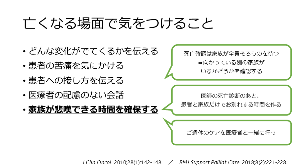 家族が悲嘆できる時間を確保する J Clin Oncol. 2010;28(1):142-148. / BMJ Support Palliat Care. 2018;8(2):221-228.