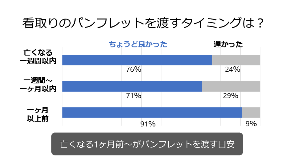 以上前 ちょうど良かった 遅かった 76% 24% 29% 71% 9% 91% 亡くなる1ヶ月前~がパンフレットを渡す目安
