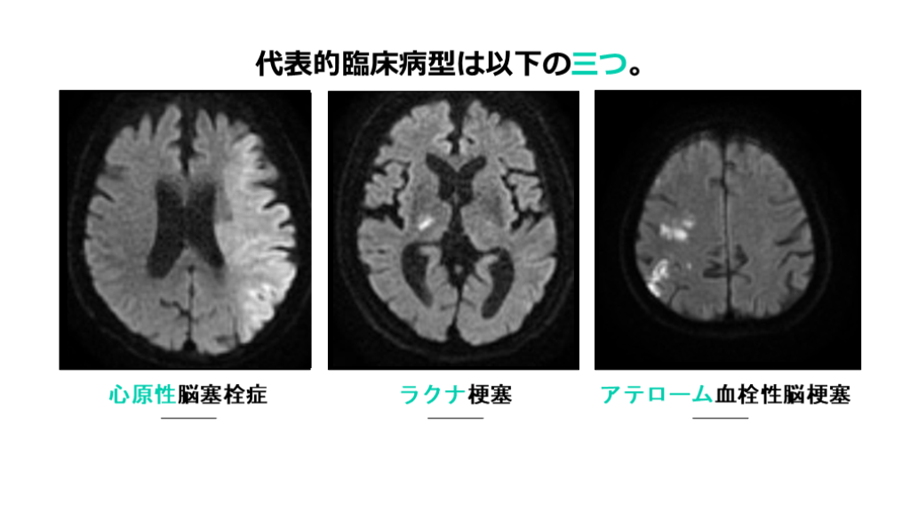 3大病型とは、ラクナ梗塞、アテローム血栓性脳梗塞、心原性脳塞栓症です。