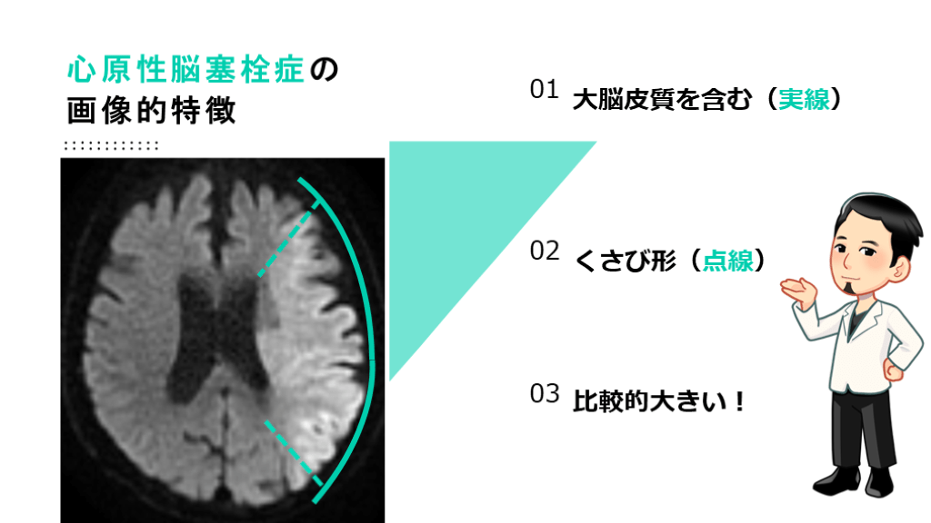 このような病歴から、塞栓性機序で脳梗塞を発症した。と推測しよう。 塞栓性機序の