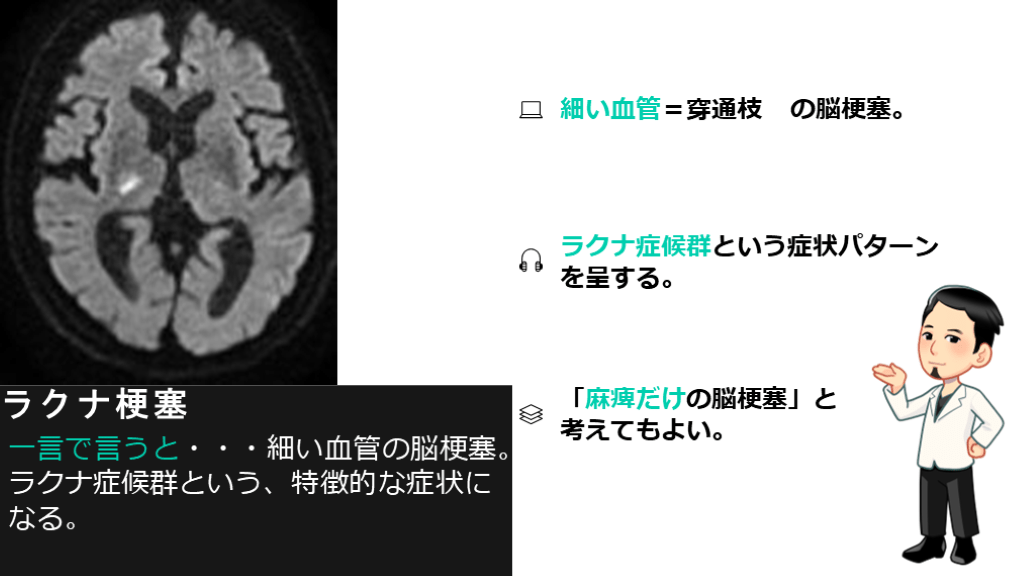 を呈する。 細い血管=穿通枝 の脳梗塞。 「麻痺だけの脳梗塞」と
