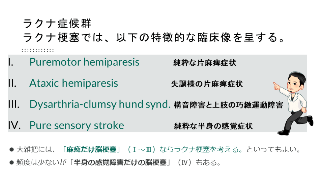 詳しくは、ラクナ症候群のDysarthria clumsy hand syndrome.