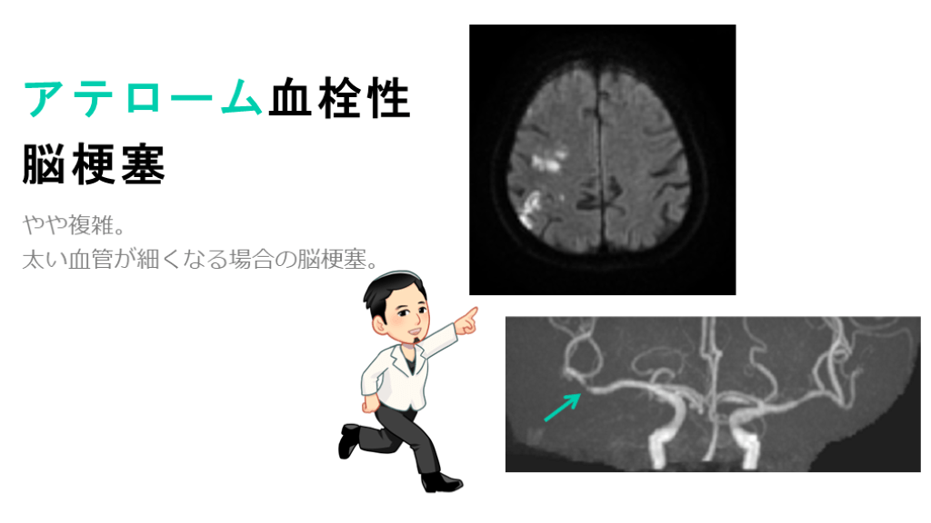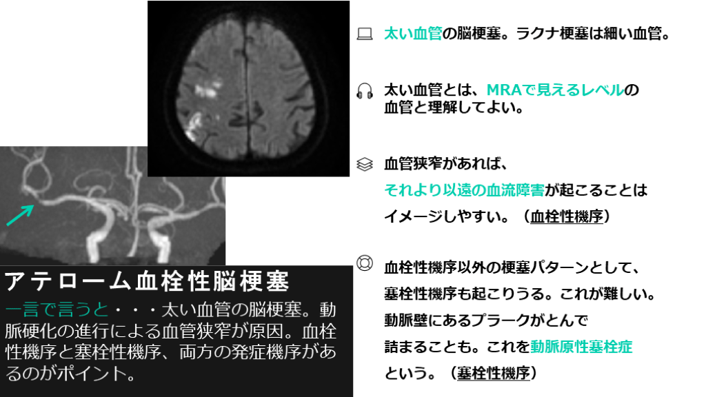 #15. アテローム血栓性脳梗塞 一言で言うと・・・太い血管の脳梗塞。動脈硬化の進行による血管狭窄が原因。血栓性機序と塞栓性機序、両方の発症機序があるのがポイント。 太い血管とは、MRAで見えるレベルの