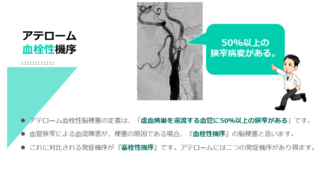 これに対比される発症機序が『塞栓性機序』です。アテロームには二つの発症機序があり得ます。 50%以上の