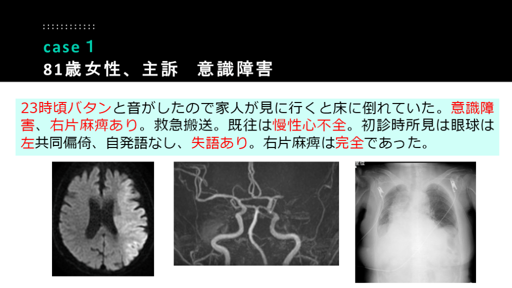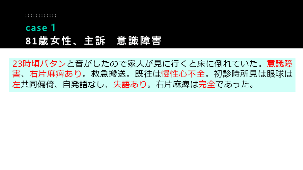 #30. 23時頃バタンと音がしたので家人が見に行くと床に倒れていた。意識障害、右片麻痺あり。救急搬送。既往は慢性心不全。初診時所見は眼球は左共同偏倚、自発語なし、失語あり。右片麻痺は完全であった。 case1
